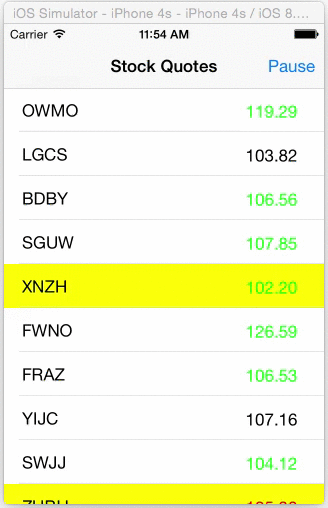The symbol property of the view model is constant and the view just takes the initial state. The price property is dynamic, as a result RACObserve is used to observe changes to the property (via KVO). Because cells can be recycled, we want to stop observing changes to the associated view model when recycling occurs. The simplest way to achieve this is to use the ReactiveCocoa takeUntil operation to ‘terminate’ the signal at the point of recycling.
